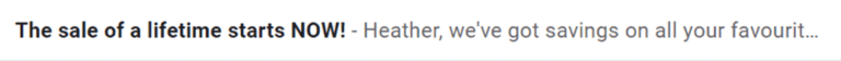 Eine wirksame Methode, um die Aufmerksamkeit sofort zu gewinnen, ist die Personalisierung. Das vorliegende Beispiel verdeutlicht dies: Der Vorname des Kunden weckt das Interesse, bevor die Mitteilung über die attraktive Verkaufsaktion erfolgt.