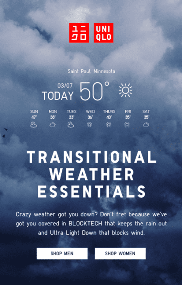Ein Beispiel hierfür ist eine E-Mail, die basierend auf den Wetterbedingungen im Gebiet des Empfängers personalisiert wird:.
