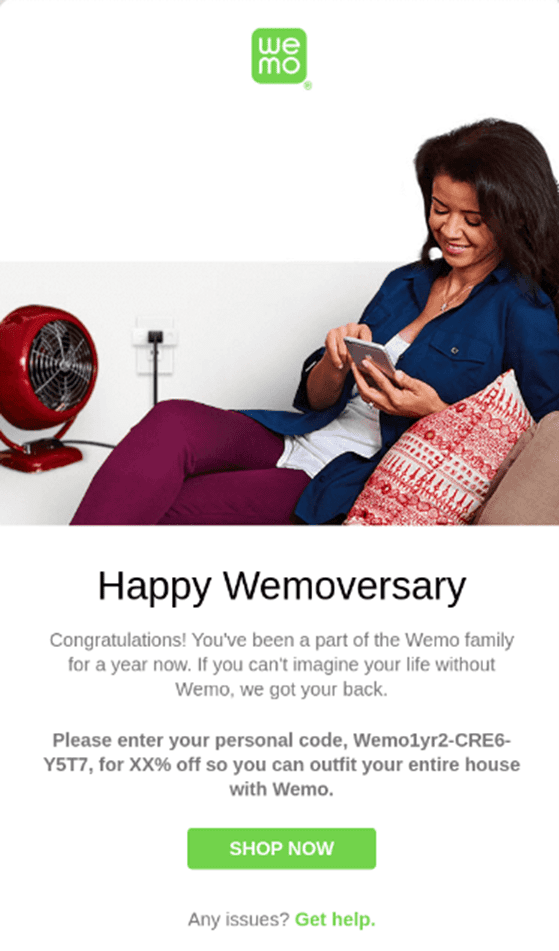 Sowohl Personalisierung als auch Beziehungsmarketing lassen sich durch Jubiläums- oder Erinnerungs-E-Mails optimieren. Diese Nachrichten kennzeichnen besondere Momente in der Beziehung zwischen Marke und Kunde, wie beispielsweise diese E-Mail zum „1-Jahres-Jubiläum“.