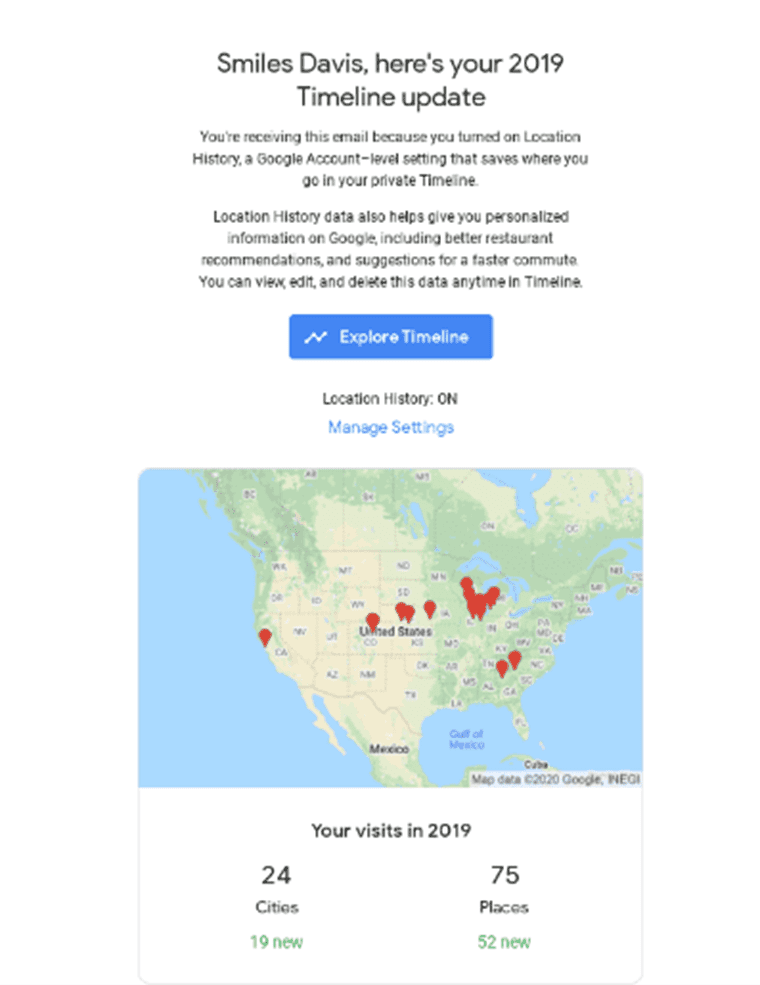 Ein gängiges und geschätztes Vorgehen im Bereich der personalisierten Ansprache ist die Übermittlung einer E-Mail-basierten Übersicht der Aktivitäten oder Interaktionen des Kunden im vorangegangenen Jahr. Obwohl viele Marken diese Versandstrategie häufig zum Jahreswechsel nutzen, sind auch Anlässe wie Jubiläen oder Geburtstage geeignet, wie beispielsweise dieses Beispiel von Google Maps zeigt.