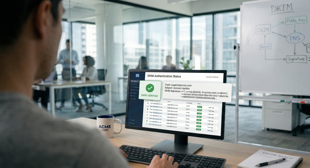 DKIM is de digitale handtekening onder je e-mail. De ontvanger controleert of die handtekening klopt.